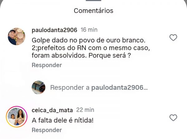 Ex-presidente da Câmara e tio de dois secretários da gestão, Paulo Dantas fez apelações emocionais e disparou: “Esse golpe de cassar o prefeito, que vinha trabalhando bem…”, disse na tribuna em vídeo gravado. Em comentários feitos no instagram, o vereador foi além e questionou: “Golpe dado no povo de Ouro Branco. 2 prefeitos do RN com o mesmo caso, foram absolvidos. Por que será?”, escreveu. O TRE por 5×2 acompanhou o relatório técnico da Procuradoria Regional Eleitoral (PRE).