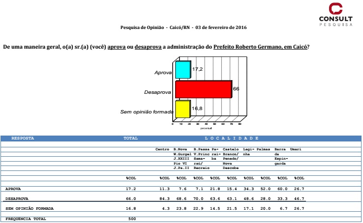 O prefeito Roberto Germano não tem feito uma boa gestão em Caicó. Pelo menos é o que ficou constatado com os dados da pesquisa Consult encomendada pelo Blog do BG. Pelos números levantados, 66% dos caicoenses desaprovam a gestão. Números altos se considerado que esse ano é ano eleitoral em que Roberto Germano tenta se reeleger. Segundo a pesquisa, apenas 17,2% aprovam a forma como o prefeito tem gerido o Município. Os outros 16,8% não tiveram opinião formada sobre o assunto.