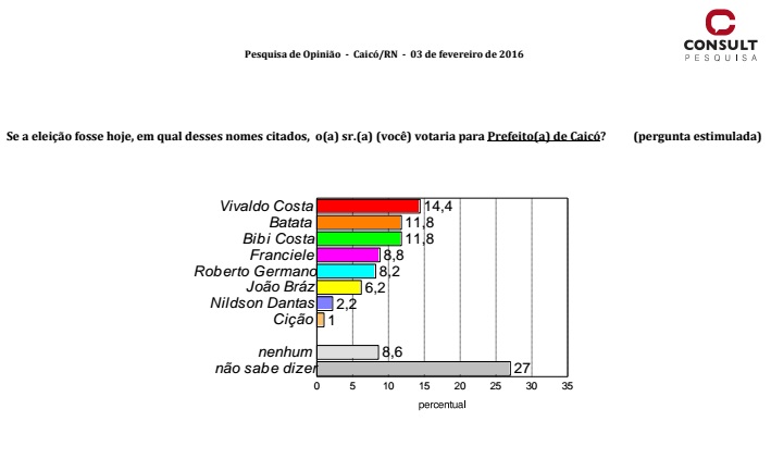 O Blog do BG e o programa Meio-Dia Cidade, da 94 FM, publicam nesta segunda-feira (15) a primeira pesquisa eleitoral do ano realizada em Caicó. De acordo com os números da pesquisa estimulada realizada pelo instituto de pesquisas Consult, Vivaldo está com 14,4% das intenções de voto, uma vantagem de quase 3% em relação aos segundos colocados: o vereador Batata e o ex-prefeito Bibi Costa, ambos com 11,8%.