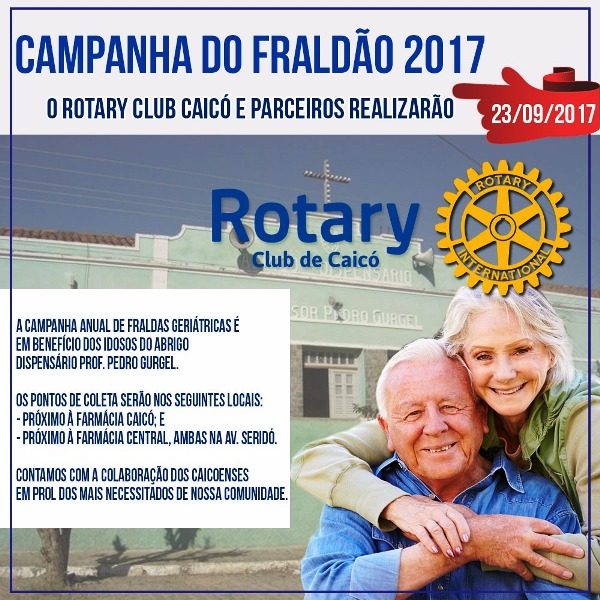 O Rotary Club Caicó realiza mais uma Campanha do Fraldão 2017, cuja arrecadação será toda destinada para os idosos do Abrigo Professor Pedro Gurgel.